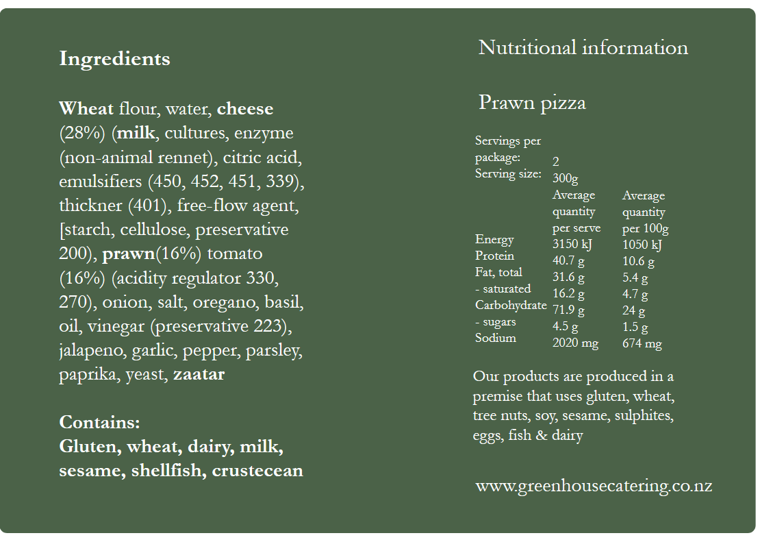 prawn, cream cheese, parsley wheat flour, yeast, salt, oil, onion, garlic, pepper, chilli, paprika, oregano, thyme, tomato (citric acid) cheese (milk, cultures, enzyme (non-animal rennet), free-flow agent, starch, cellulose, preservative 200),