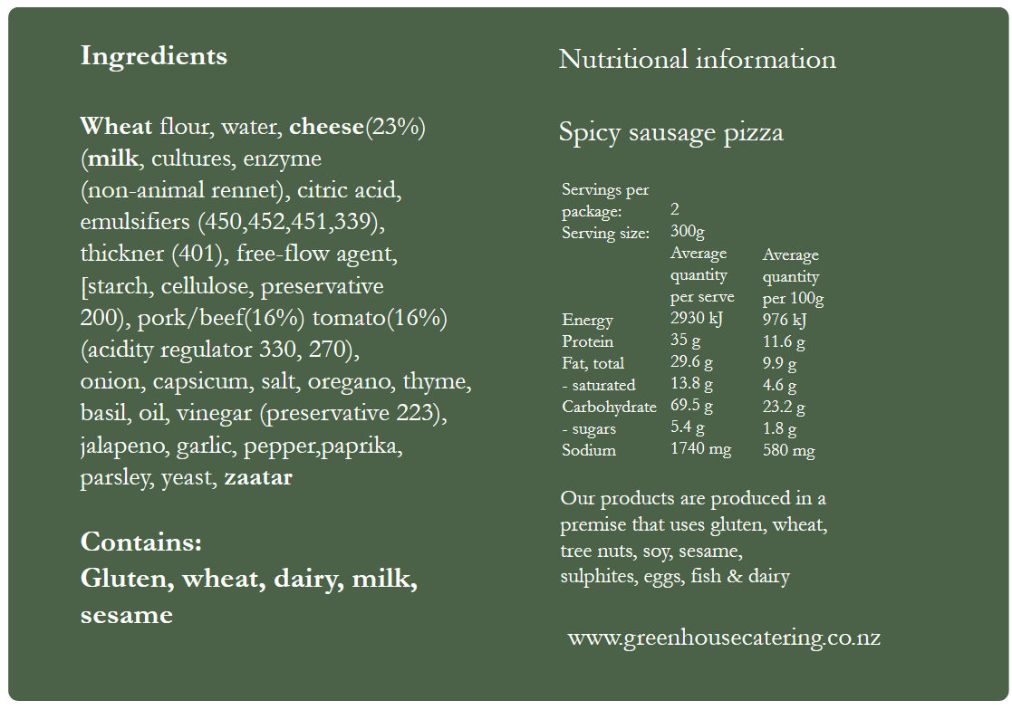 chorizo sausage, cream cheese, jalapeno, capsicum, parmesan, wheat flour, yeast, salt, oil, onion, garlic, pepper, chilli, paprika, oregano, thyme, tomato (citric acid) cheese (milk, cultures, enzyme (non-animal rennet), free-flow agent, starch, cellulose, preservative 200)